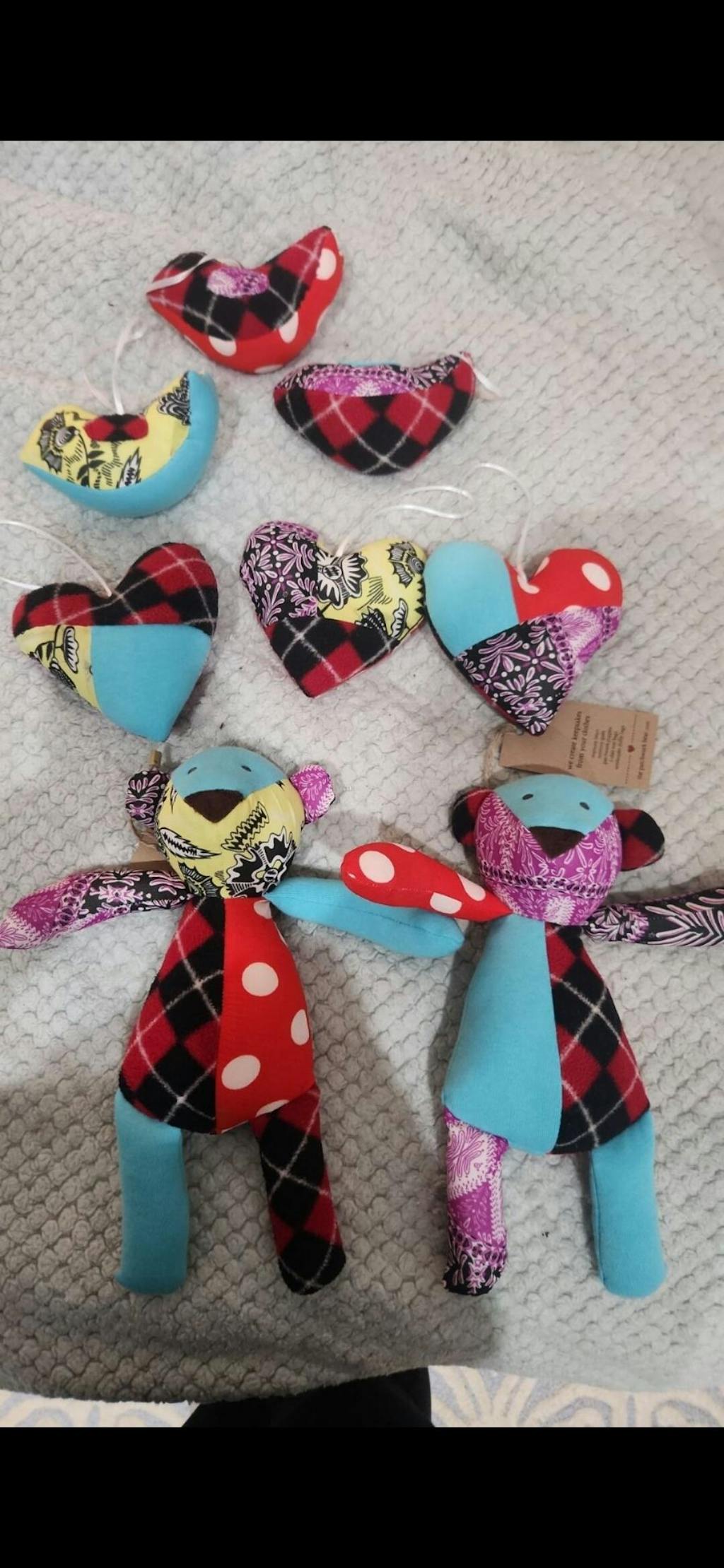 I actually am having trouble coming up with the words to describe how happy I am with my order. I was so nervous to send my late mother's clothing out to some strangers to cut them up and make things. I'm so glad I did. Firstly, the Patchwork Team handled everything with cate and respect. They answered all questions I had prior to the order, let me know when they received the clothing so I knew it was safe, had my order weeks before I expected, and despite me not making the deadline for a christmas delivery, STILL had them to me the week before. I gave some special requests and everything came out just beautifully. Thank you. I really cherish these. You used a talent of yours to bring love and joy into the world. Thank you. I'm copying this into all the products i purchased. I bought a lot! 1 bunny, 3 bitty bears, 4 hearts, and 4 birds.
