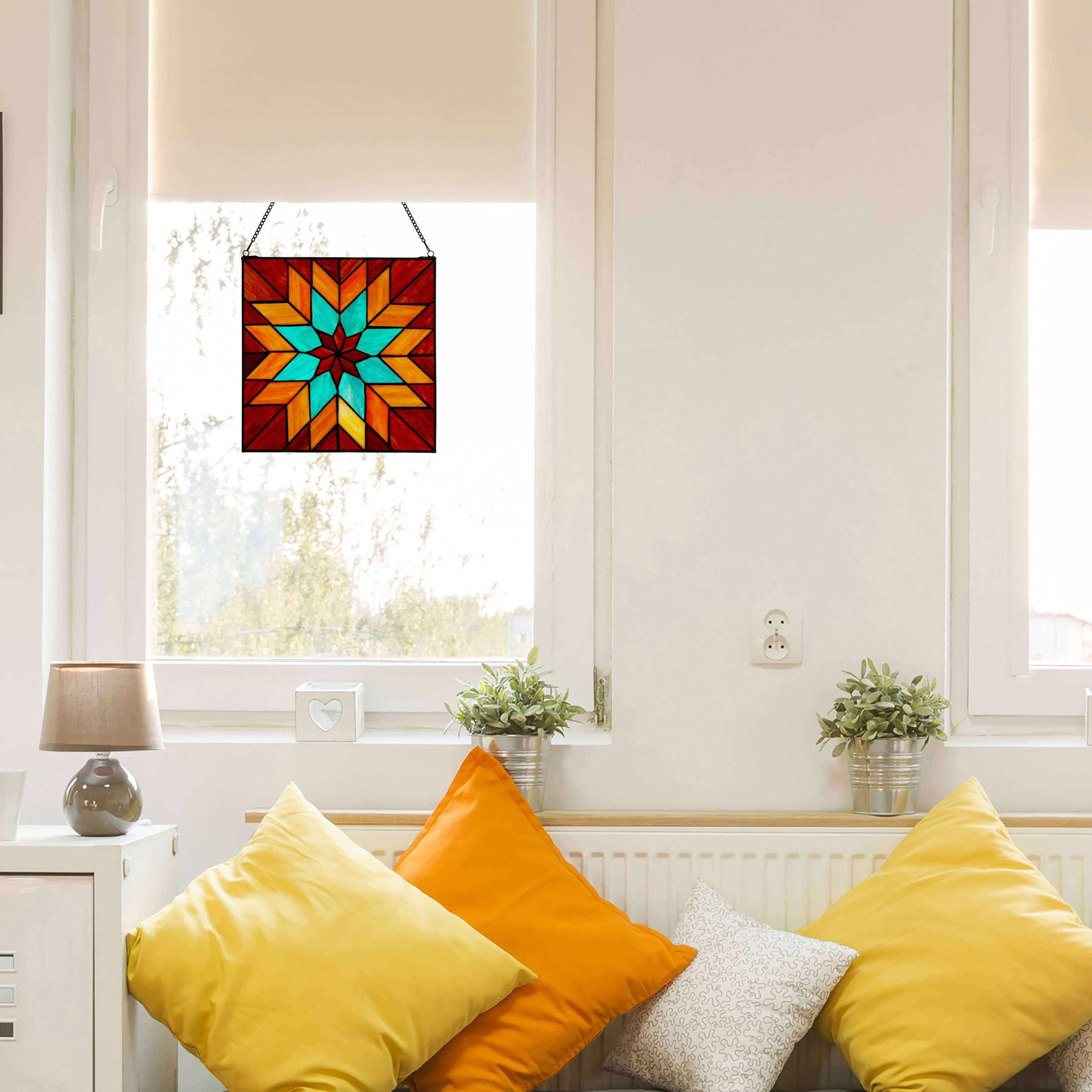 It features a quilt-like geometric floral design in red, teal and orange hues that become more vibrant when light passes through the glass. Plus, the stained glass suncatcher comes with an attachable decorative hanging chain for easy display in your living room, dining room or entryway. Perfect addition to your fall decor.