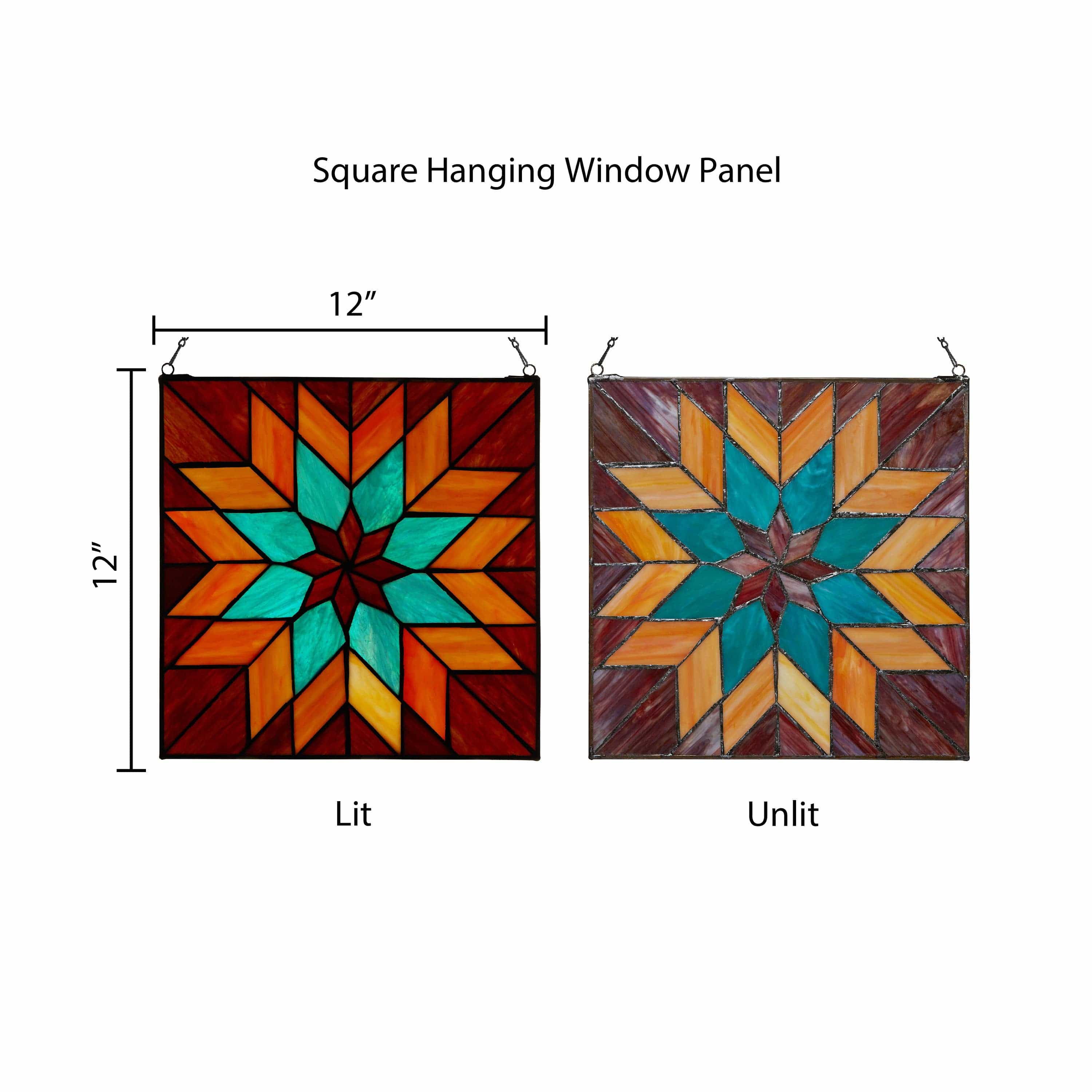 Overall Dimensions: 12"L x 0.25"W x 12"H Stained glass window panel with 56 individual glass cuts Geometric floral design in red, teal and orange hues Stained glass pieces are soldered by hand using the copper foil method Hang in a window to catch sunlight or display on a wall Includes a 24" decorative chain for convenient display Clean with damp cloth or lemon oil polish; dry with clean, dry cloth