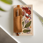 Keep your favorite notebooks and writing accessories together forever with our new notebook pouches. Embroidered design on soft faux suede, fully lined with an elastic band that fits around most notebooks.
