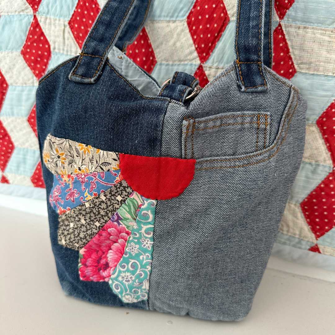 Custom upcycled DENIM DRESDEN BAG! This is made from a vintage dresden plate quilt, highlighted with a red half moon applique. Two tone denim featuring pocket and coin pocket make this unique bag fun & practical.
