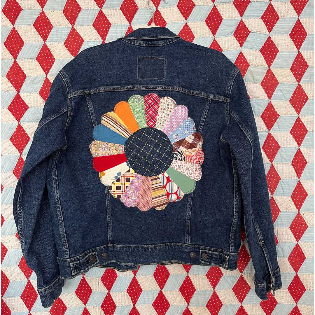 We lovingly upcycled this Levis jacket and hand-appliqued a full Dresden Plate on the back! Featuring feedsacks and vintage prints with sashiko-style hand-stitching in the center of the block. Additional sashiko stitching on the sleeve for detail.