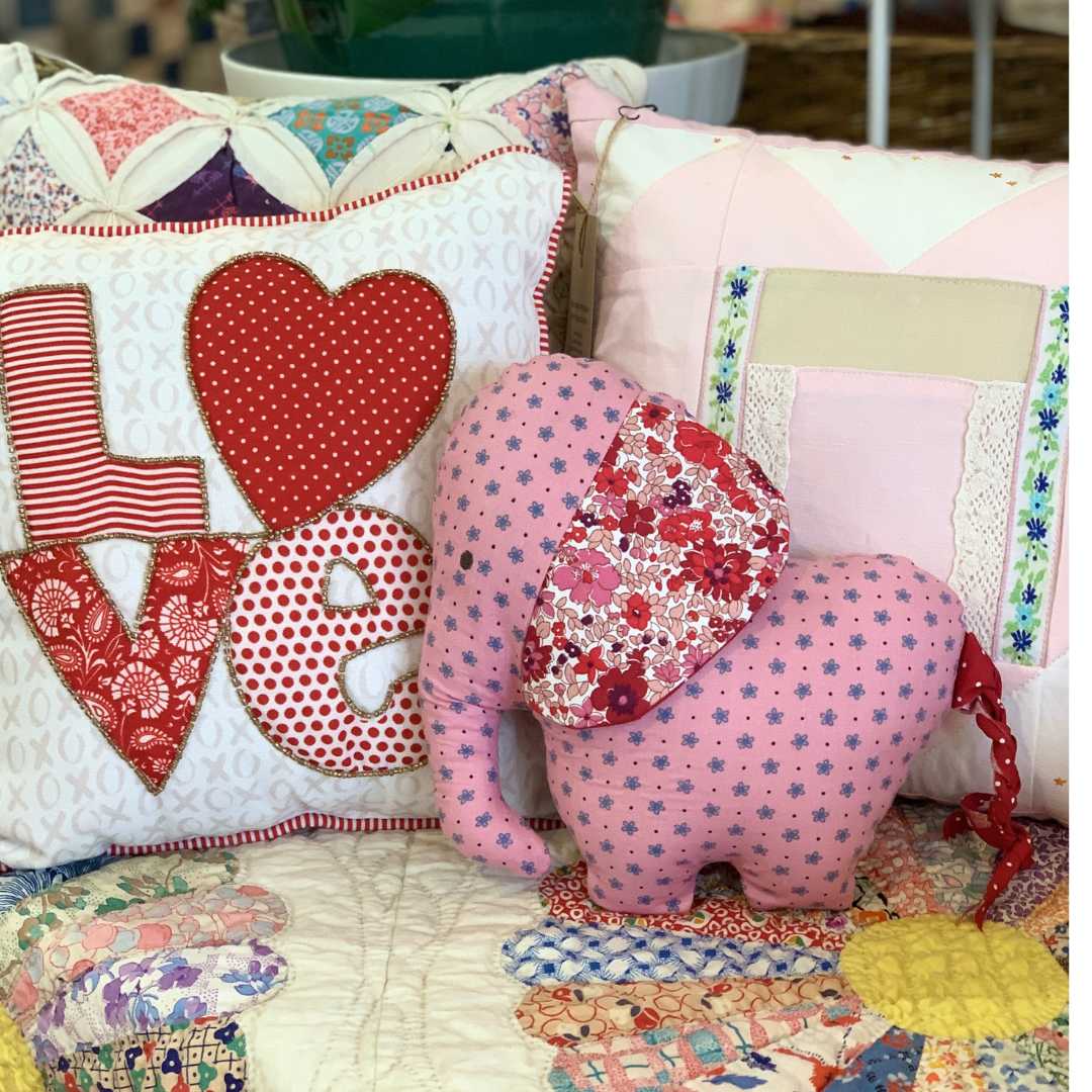 Patchwork elephant with LOVE pillows and red Liberty fabric.